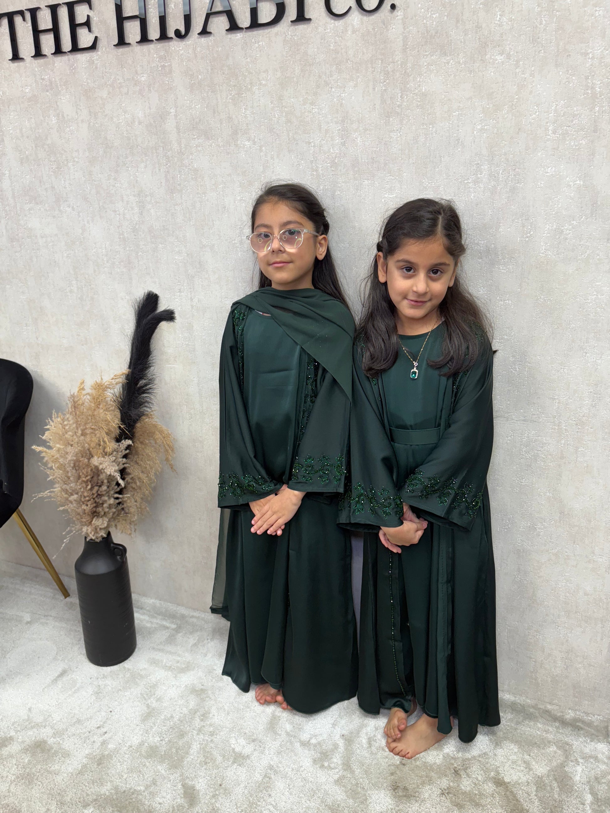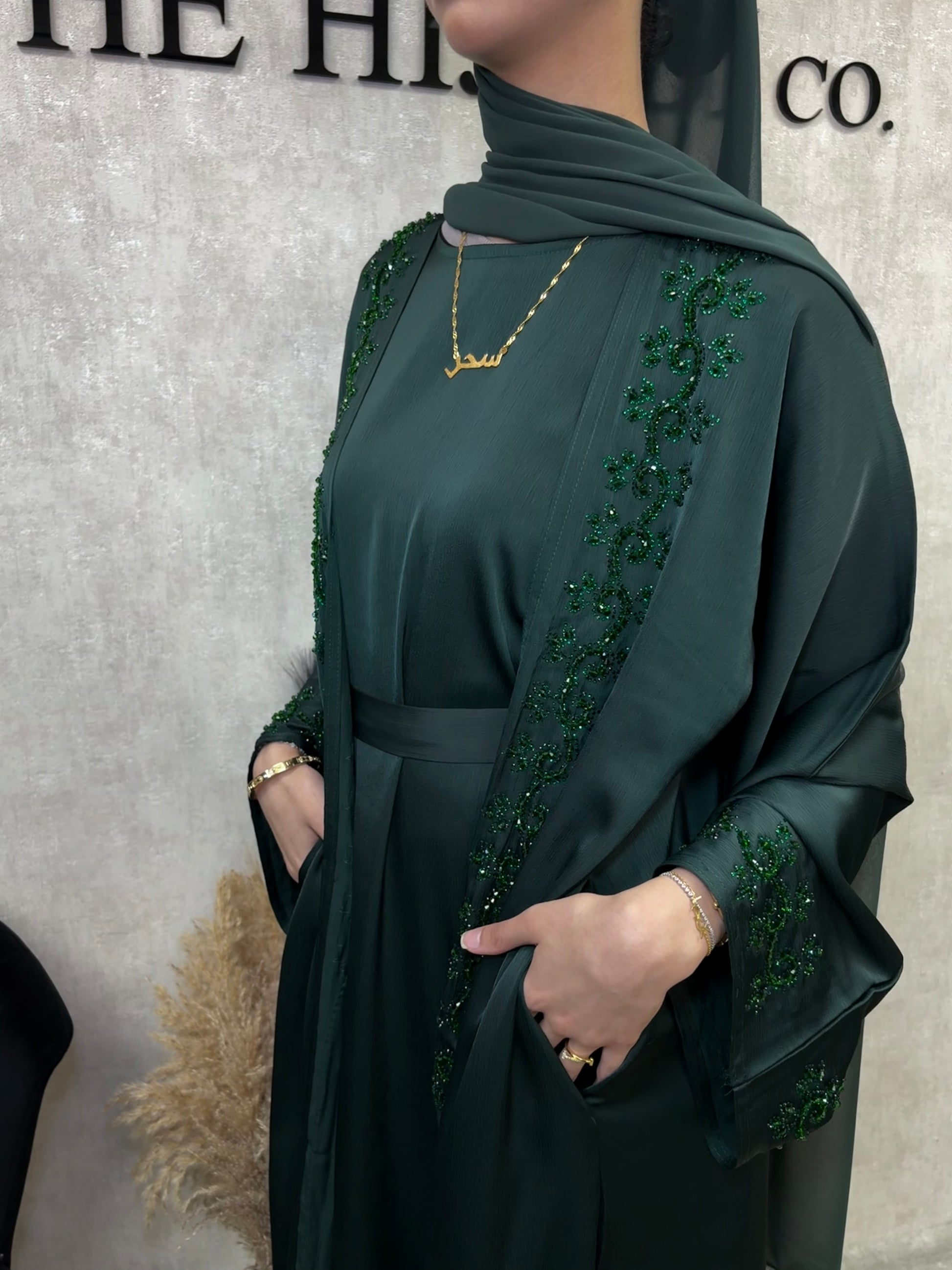 Indulge in luxury with our Amara Abaya set in Emerald. Made from silky satin fabric, this 4 piece set includes an inner slip dress, outer embellished abaya, matching hijab, and belt. Featuring intricate embellishments on the front and sleeves, this set is a true work of art.