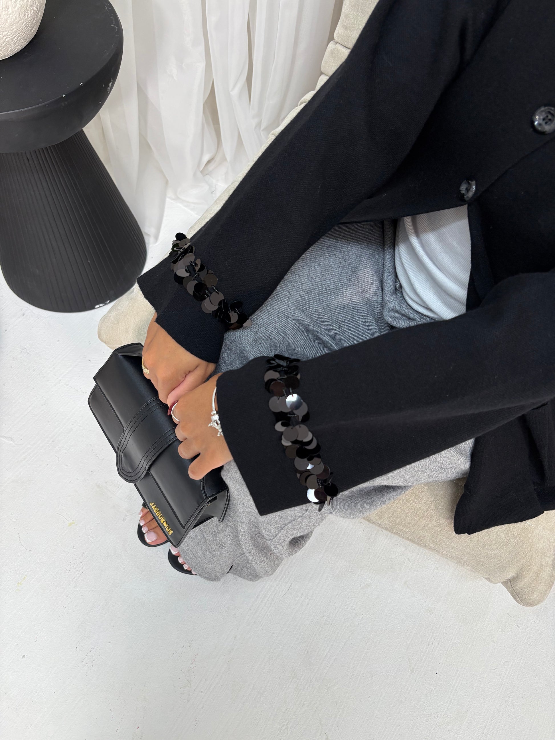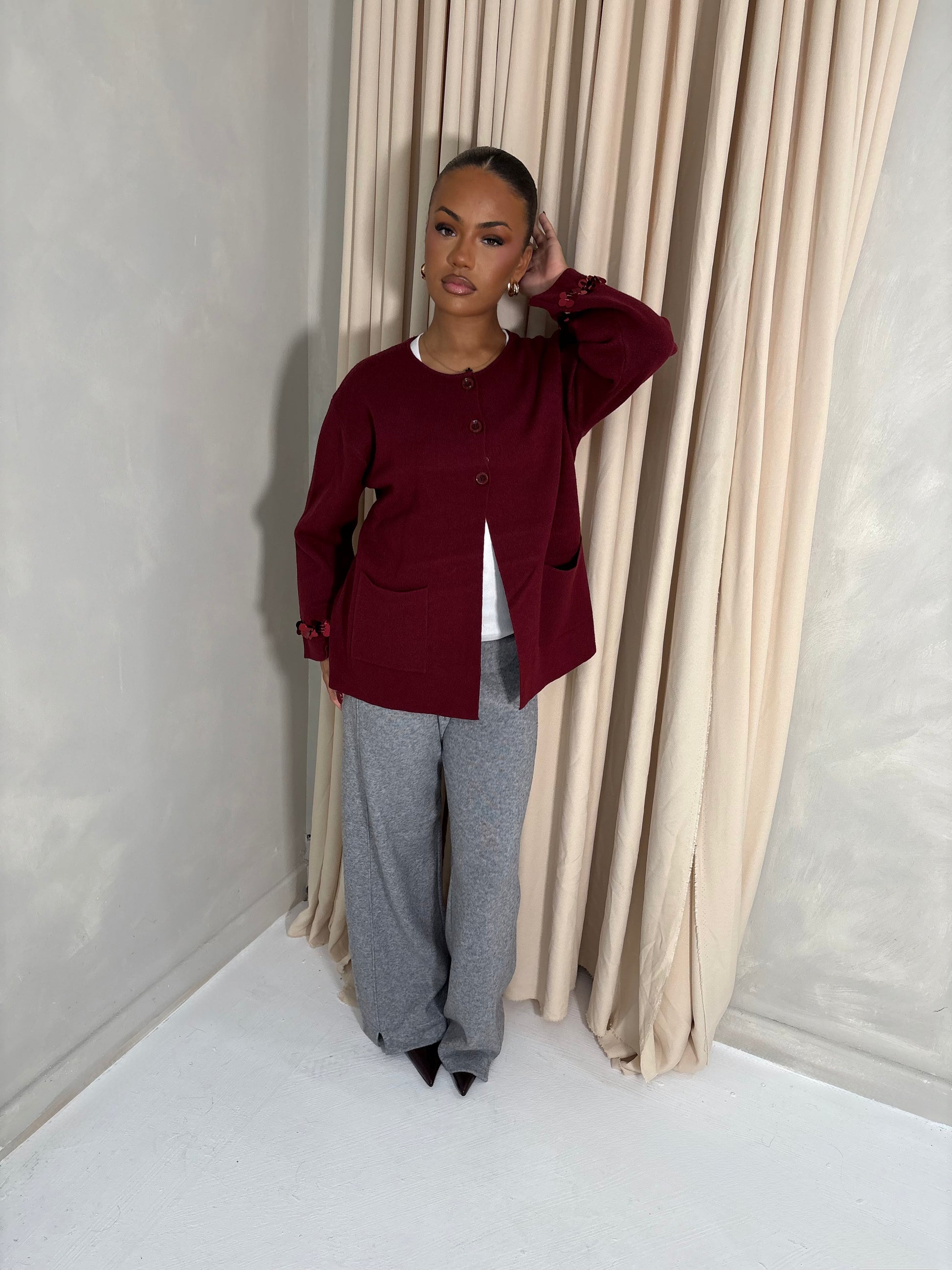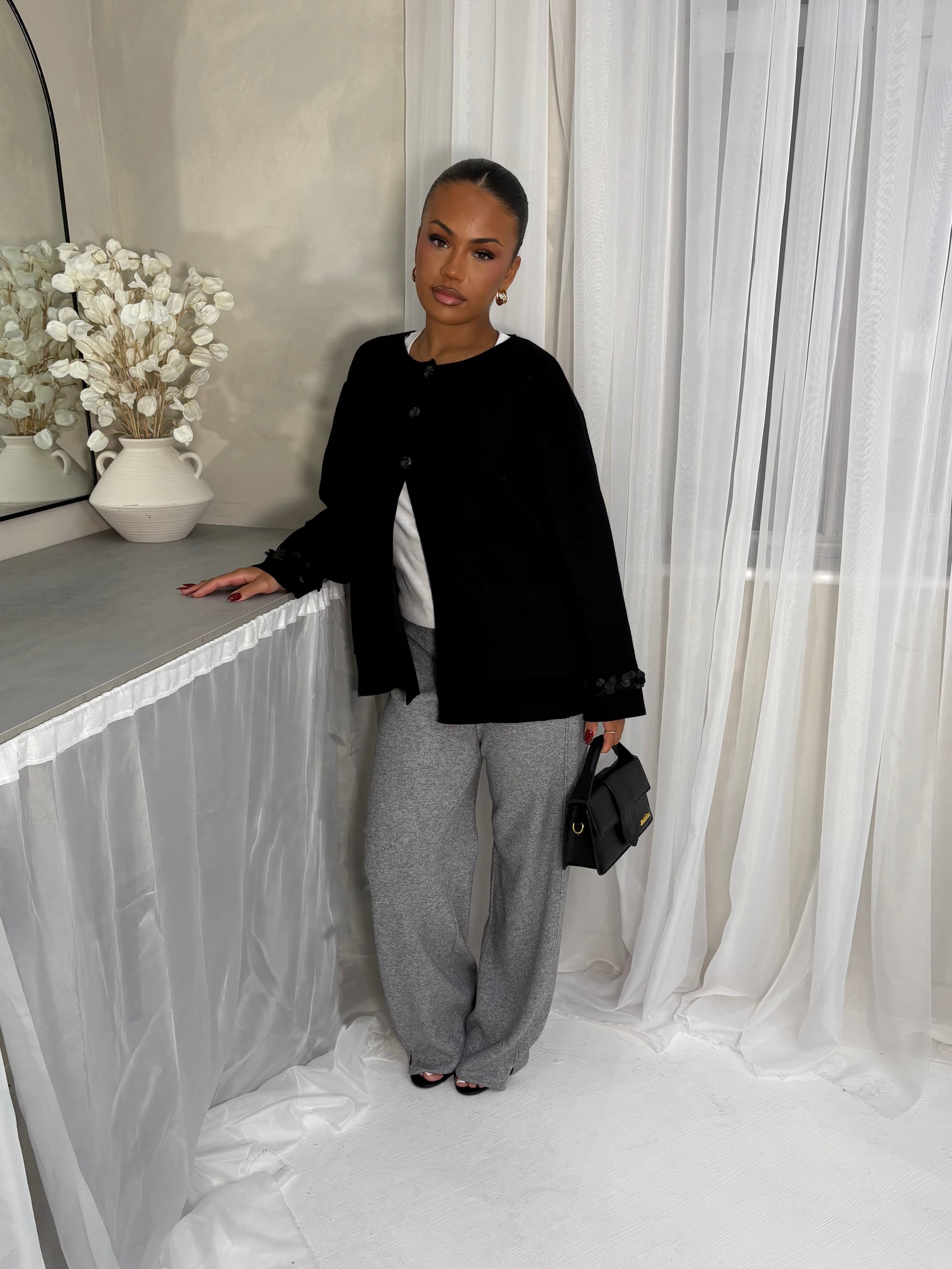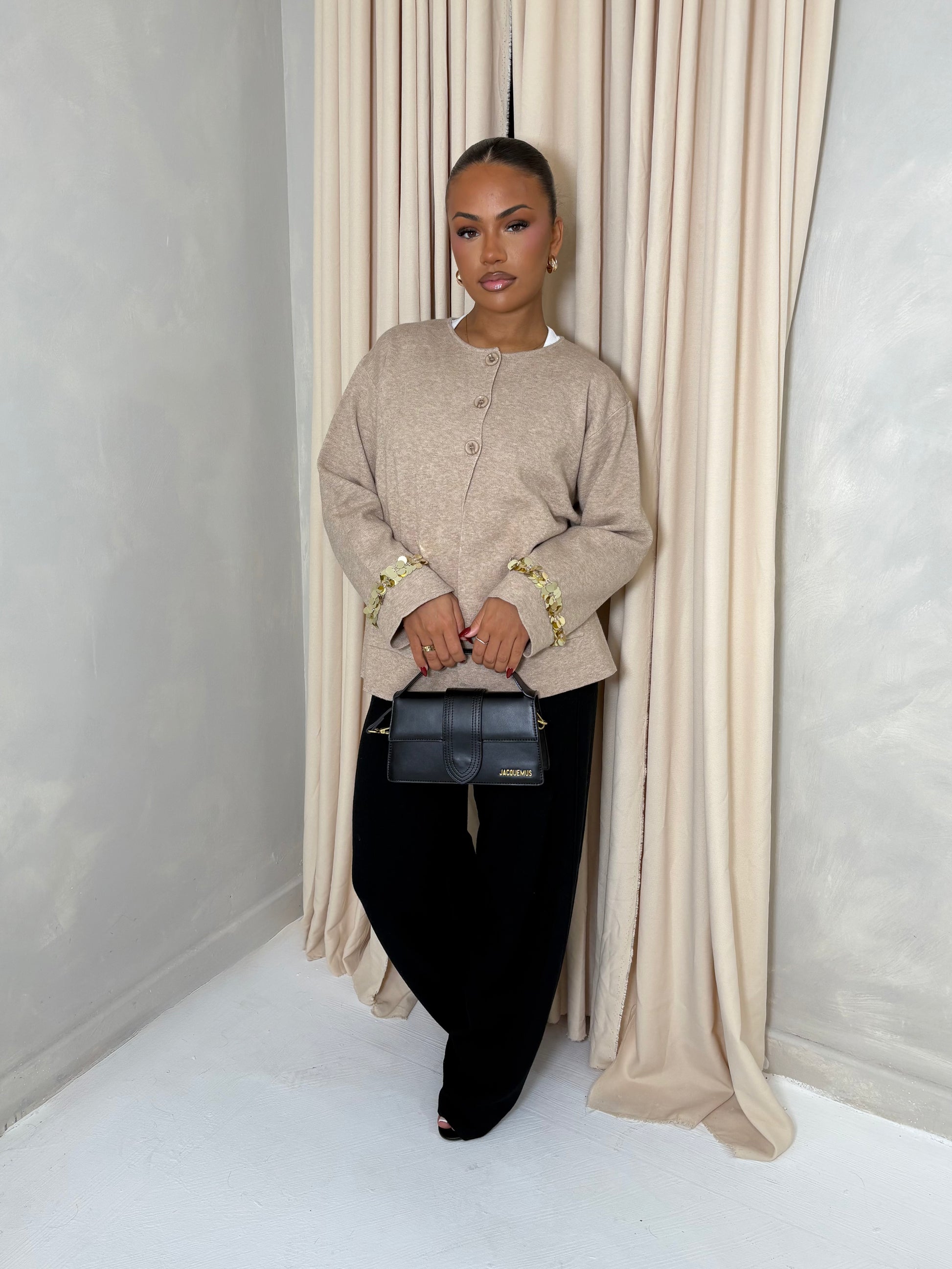 The Réin Sequin Detailed Cardigan is crafted from a soft knit and finished with delicate sequin detailing along the sleeves for a subtle shimmer. Designed with three buttons at the neckline for a relaxed open fit, it features two side pockets and a silhouette that falls slightly below the waist.